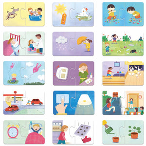 עם 16 צמדים של סיבה ותוצאה נהדרים באיורים מאוד ברורים וקלילים להמחשה לילדים, תוכלו לעבוד ולשחק על המון תוכן מתקדם, ולחזק שפה תקשורת ולוגיקה פשוטה. תנו להם להרכיב את האירועים השונים ולנסות להבין מה הוביל למה.