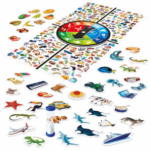 בכל פעם שתסובבו את הספינר יהיה לכם זמן לחפש ולמצוא בשולחן כמה שיותר פריטים של הנושא או משפחת הנושאים שהחוגה מורה. בגדול יש קבוצת בעלי חיים, עצמים ומאכלים. ויש גם קבוצות קטנות יותר – למשל בעלי חיים מחולק לארבע קבוצות – הולכים על ארבע, חיים במים, מעופפים וזוחלים.