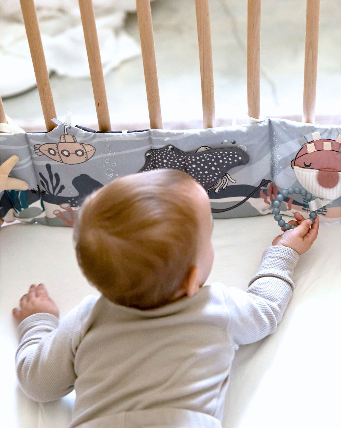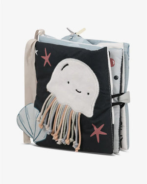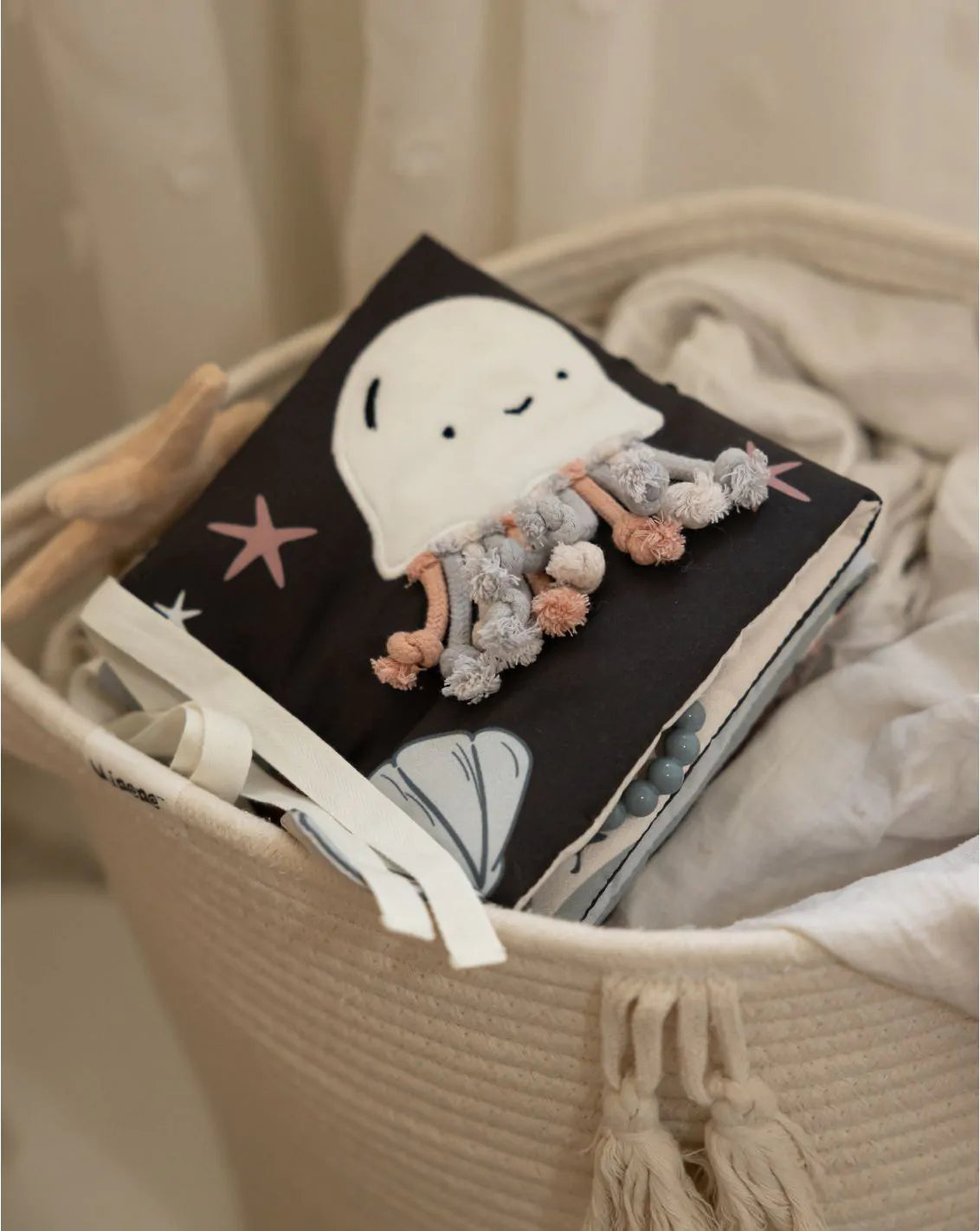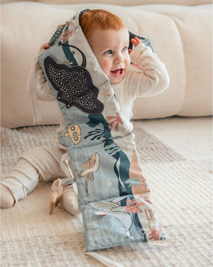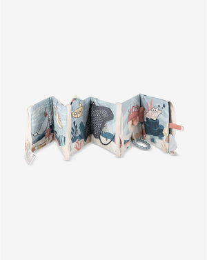 ספר בד חוויתי דו צדדי מכיל 15 פעילויות ומגוון גירויים מרקמיים, משחקיים ומרשרשים למשיכה, הצצה, נשיכה ומישוש.