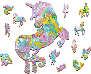 פאזל עץ מהודר בצורת חד-קרן עם 48 חלקים צבעוניים, מעוצבים בעבודת יד מדויקת ובאיכות גבוהה במיוחד. חלק מהחלקים מגיעים בצורות מיוחדות של דמויות מהאגדה – כמו חדי-קרן קטנים, דרקונים ויצורים מופלאים.