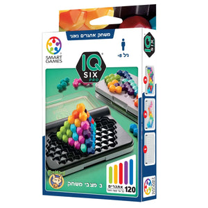 כולל 120 אתגרים ב 3- מצבי משחק – 2 בדו-ממד IQ-SIX PRO ואחד בתלת-ממד. בתוך קופסת המשחק יש לוח המתאים לאתגרים דו-ממדיים ולאתגרי פירמידה תלת-ממדיים. בגב הקופסה יש לוח בצורת פרפר לאתגרים דו-ממדיים. לכל אתגר יש רק פתרון אחד!